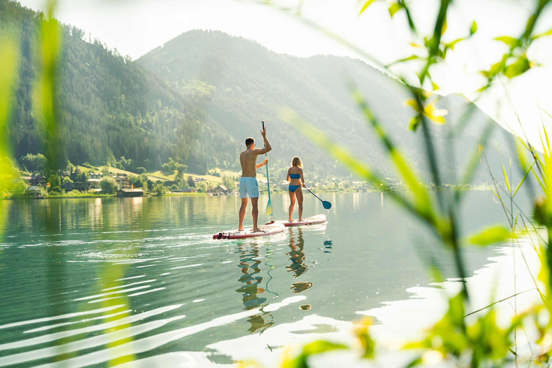 Für Momente der Entspannung stehen Liegen und Schirme bereit, während Sie das sanfte Rauschen des Wassers und das Zwitschern der Vögel begleiten. Wer aktiv sein möchte, kann unsere SUPs und Ruderboote nutzen und den See vom Wasser aus erkunden – ganz nach Lust und Laune. Hier am Badestrand des Weissensees verschmilzt Sommerfreude mit der Achtsamkeit für die Natur – ein Platz, an dem Sie einfach Sie selbst sein dürfen.